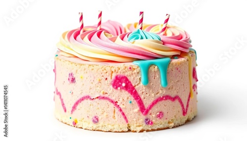 Hyperrealistic bright birthday cake, vibrant frosting, isolated on white, anniversary, party