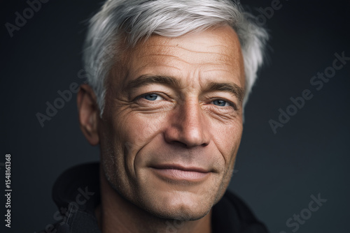 Hyper-realistic close-up portrait of a smiling mature man expressing warmth and confidence