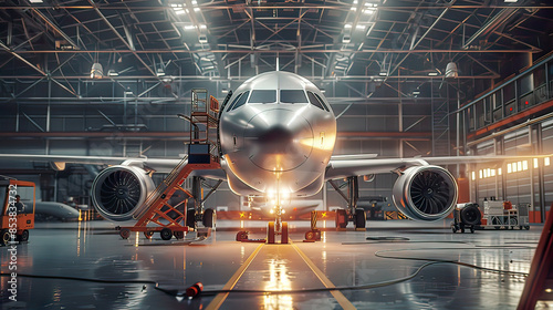 Hyper-realistic image of a passenger jet plane under maintenance in a hangar detailed view of the back of the aircraft with the door open intricate mechanical systems being checked