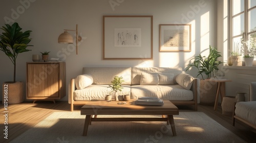 Hyperrealistic photo of a modern living room bathed in warm natural light, showcasing minimalist furniture and calming decor. The cozy and bright atmosphere evokes a high-end magazine feel, captured
