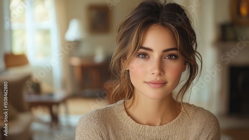 Hyperrealistic Portrait of a Young Woman in a Cozy Indoor Setting with Soft Natural Lighting