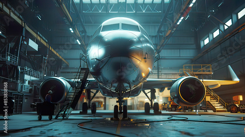 Hyper-realistic scene: Aviation hangar interior airplane mechanic working on service clear focus.