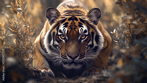 Hyper-Realistic Tiger Crouching Among Shrubs: Graphite & Watercolor Art