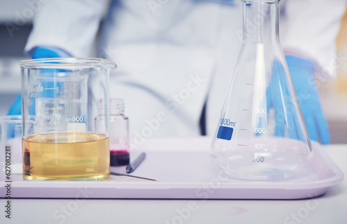 I have all I need for the experiment. Closeup of an unrecognizable scientist standing next to a tray of test tubes with chemicals in them ready to be used for experiments.