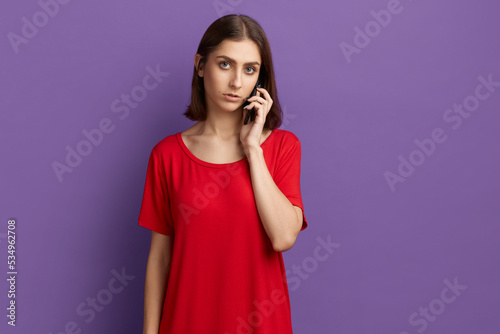 I have unexpected call. Confused young pretty brunette girl in red t-shirt talking on cellphone. Listens something unpleasant and looks at the camera. Has embarrassed look. Posing over purple wall.