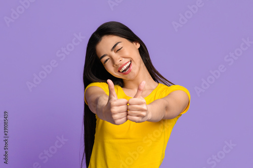 I Like It. Joyful Young Asian Woman Showing Thumbs Up At Camera