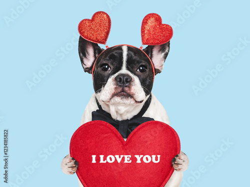 I Love You. Cute puppy, red heart and congratulatory inscription. Closeup, indoors. Studio shot. Congratulations for family, relatives, loved ones, friends and colleagues. Pet care concept