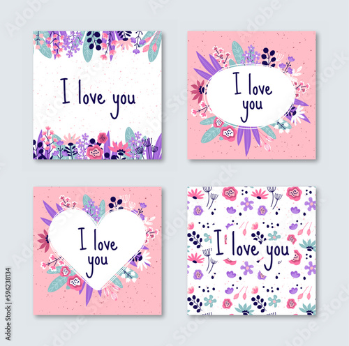 I love you floral cards set. Collection of posters for website with flowers. Greeting cards for Valentines Day and wedding anniversary. Cartoon flat vector illustrations isolated on grey background