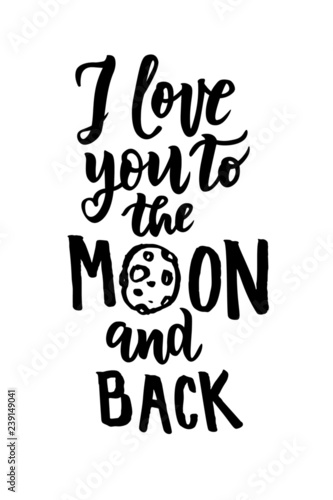 I love you to the moon and back hand lettering text for Valentine's Day celebration. Romantic quote. Good for card, banner, invitation, poster template. Vector illustration.