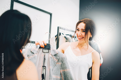 I want to make you stylish! Beautiful young woman trying to choose clothes to her customer while working in the fashion boutique. Fashion stylist show new collection and trends in store