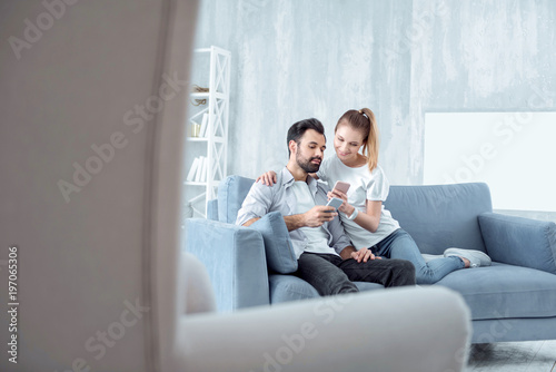 I will teach you. Positive delighted girl sitting on the couch and keeping smile on face while embracing her boyfriend
