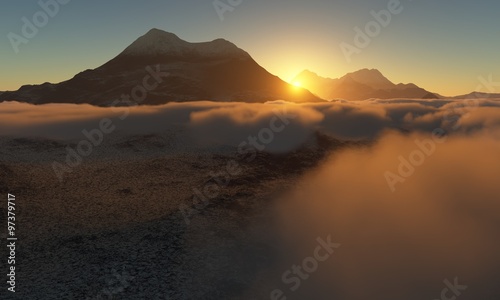 Ice age. Icy wasteland of the clouds in the sky, 3D render