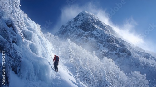 Ice Climber Ascending Frozen Waterfall in Snowy Mountain Landscape