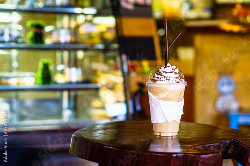 ice coffee frappe on table, plastic cup of coffee in cafe