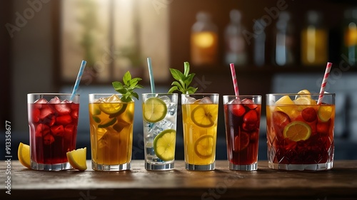 Ice cold and fresh beverage collection, ice tea, yellow citrus and red berry lemonade
