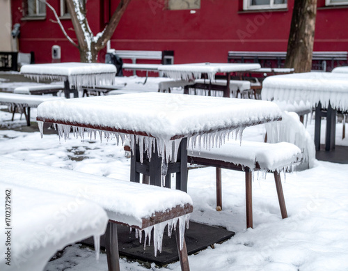 Ice Covered Outdoor Dining Tables Pedestrian Plaza Winter