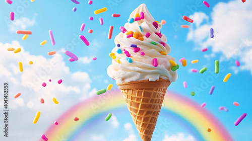 Ice Cream Cone Hovering Over a Rainbow, with Colorful Sprinkles Floating Around in Mid-Air