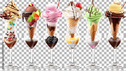 ice cream dessert, collection of sundae on white background, isolated