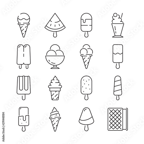 Ice cream icon. Shake fruit yogurt toppings milk delicious food ice cream from chocolate vanilla smoothie vector line symbols. Illustration ice cream chocolate and fruit dessert