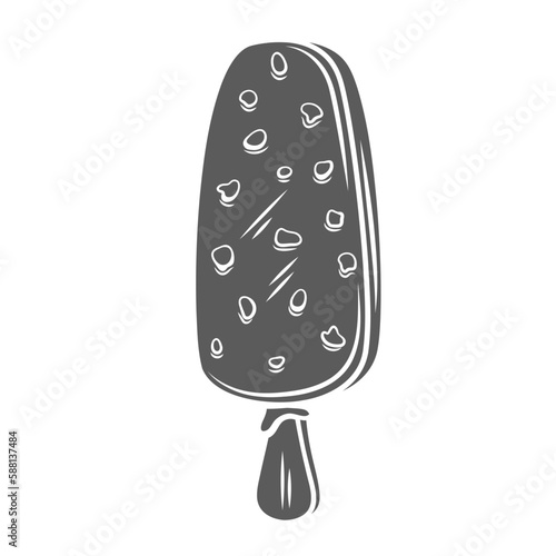 Ice cream on stick glyph icon vector illustration. Stamp of ice cream bar covered with chocolate glaze layer and crunchy nuts, whole vanilla popsicle or eskimo summer sweet snack for children