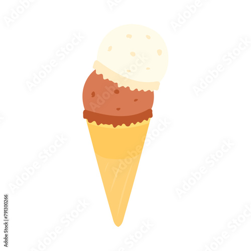 レギュラーコーンに入ったバニラ味とチョコレート味のアイスクリーム。フラットなベクターイラスト。 Ice cream with vanilla and chocolate flavor in a regular cone. Flat vector illustration.