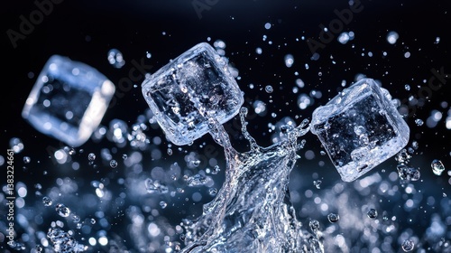 Ice cubes are falling into water, creating a splash and releasing bubbles against a dark background.