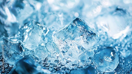 Ice cubes in a blue container with a blurred background.