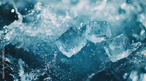 Ice cubes in blue water wave splash. Transparent water and frozen ice crystal cubes. Cooled liquid splatters, 3d realistic vector background with pouring clear aqua drops, alcohol drink spill splash
