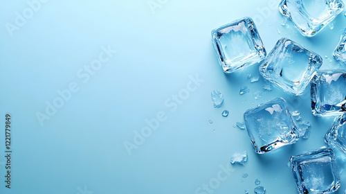 Ice Cubes on Blue Surface with Melting Water Drops and Light Reflection