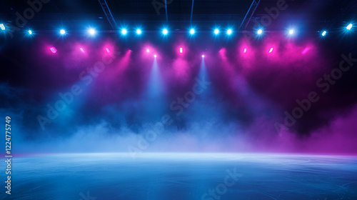Ice Rink Background. Professional Arena illuminated blue, pink neon lights, spotlights with smoke. Copyspace. Winter poster for hockey competitions. Ice skating. Stadium