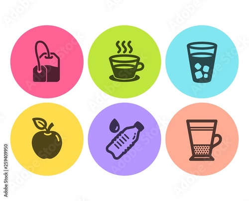 Ice tea, Apple and Coffee cup icons simple set. Tea bag, Water bottle and Double latte signs. Soda beverage, Fruit. Food and drink set. Flat ice tea icon. Circle button. Vector