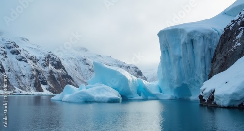 Icebergs floating in Ilulissat Icefjord, Greenland, with natural light highlighting the blue and white ice formations against a clear sky, showcasing Arctic beauty.