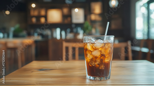 Iced americano on wooden table in cozy cafe setting