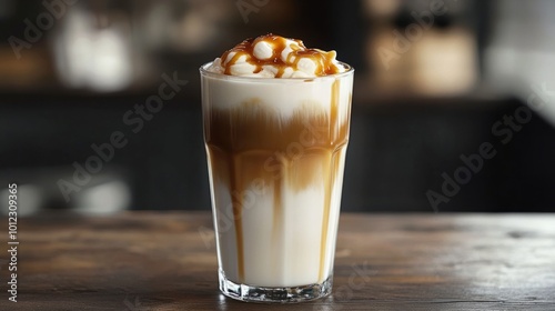 Iced caramel macchiato in a tall glass with milk layers and caramel drizzle generative ai