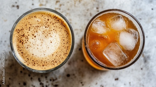 Iced coffee and juice on a table