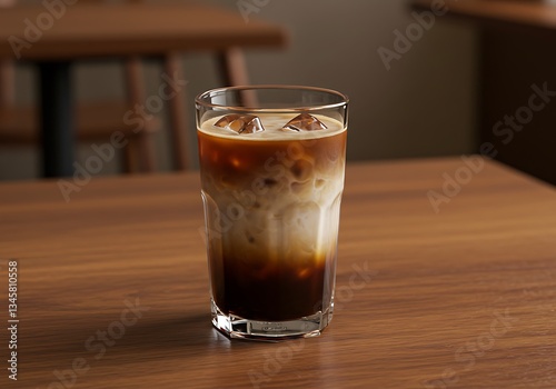 Iced Coffee Drink with Milk Swirls on a Wood Table Surface