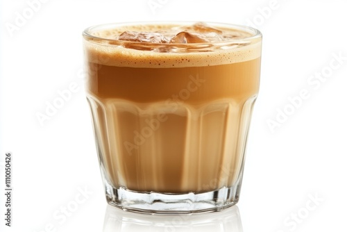 Iced coffee in a glass, frothy top. Perfect for menus, blogs, or advertising refreshing summer drinks.