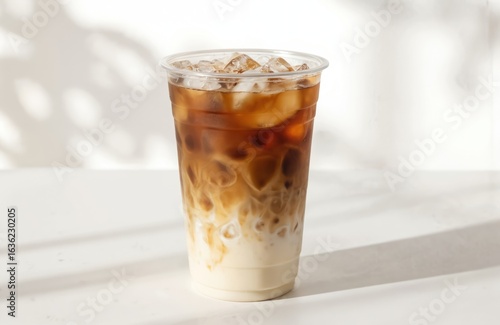 Iced coffee in clear plastic cup with ice cubes on bright background. Mix milk, cafe, barista, coffee shop theme. Refreshing summer drink. Enjoy chill taste, caffeine dose with trendy swirl.
