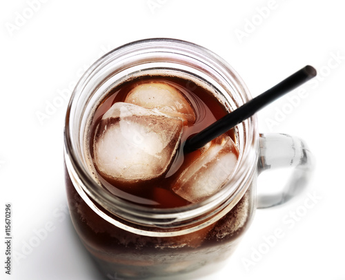 Iced coffee in glass jar on white background