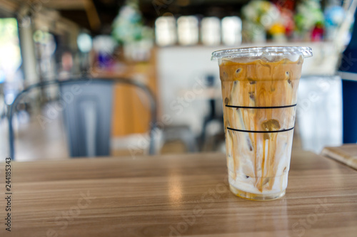 Iced coffee latte on wood table in cafe