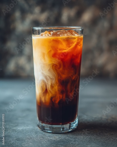 Iced Coffee with Cream Swirls and Ice Cubes in Tall Glass