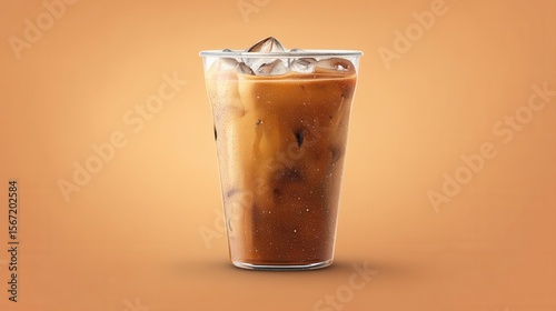 Iced coffee with milk swirls and ice cubes is served in a clear glass against an orange background