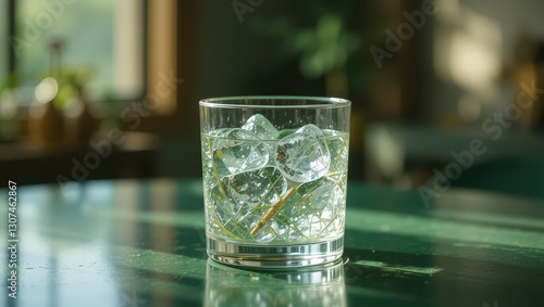 Iced drink on green table indoors