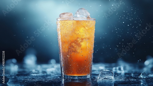 Iced juice soda in a detailed clear cup, with water droplets, set against a cool and stylish backdrop