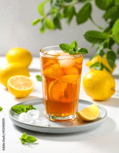 Iced lemon tea with mint and lemons on gray plate, soft daylight, fresh and clean summer vibe.