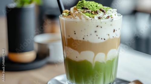 Iced matcha latte with whipped cream and green tea powder topping in glass cup