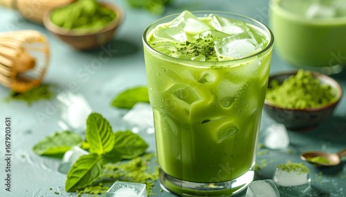 Iced matcha tea with fresh mint leaves and matcha powder.