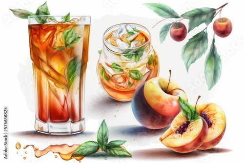 Iced tea with luscious peaches on a white background; a refreshing drink. Cocktail glasses filled with a delectable peach iced tea Cuba Libre or Long Island iced tea. Fruity drink to cool off with in