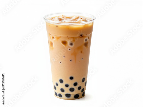 Iced tea with tapioca pearls served in clear cup isolated white background