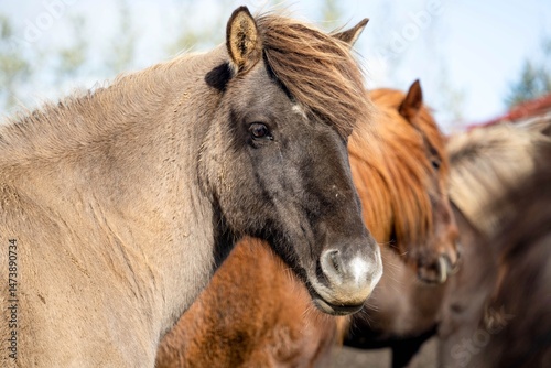 Icelandic horse with thick fur stands calmly among others in a sunny open natural setting